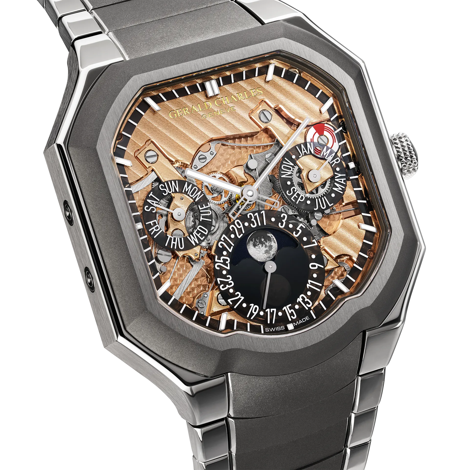 The Masterlink Perpetual Calendar introduces the world’s first in-house asymmetrical automatic perpetual calendar with a three-counter display, powered by the ultra-thin GCA11000 calibre with micro-rotor. Engineered for over 100 years of precision, it combines day, date, month, leap year, and a highly advanced moonphase within a 100m water-resistant Grade 5 titanium case, embodying Gerald Charles’ “No Compromise” philosophy.