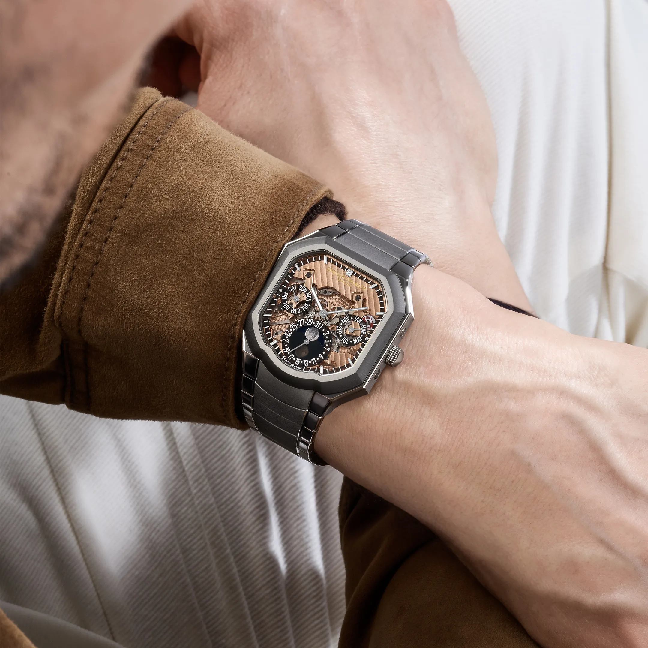 Crafted in Grade 5 titanium, the 40mm case and integrated bracelet feature Darkblast, brushed, and polished finishes, combining durability with refined tactility. The watch ensures exceptional comfort, while the ultra-thin profile, micro-adjustable bracelet, and intuitive correctors deliver a seamless and versatile wearing experience.